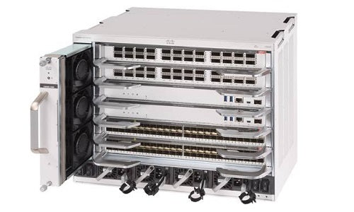 Cisco Catalyst 9600 Series Switches offer one chassis option, two supervisor options, and multiple line-card options. The Catalyst 9606R chassis provides a common architecture that can scale up to 224 native 10-Gigabit, 25-Gigabit or 50-Gigabit SFP56 Ethernet ports (or up to 256 SFP with QSFP-4SFP breakout cables), and up to 128 native 40-Gigabit or 100-Gigabit QSFP28, or up to 8 native 400-Gigabit QSFP-DD Ethernet ports. The Cisco Catalyst 9600 Series redundant chassis offers High Availability (HA) by supporting 1 + 1 redundant supervisor engines with Stateful Switchover (SSO), Non-Stop Forwarding (NSF), and full-image In-Service Software Upgrades (ISSU). NSF/SSO and ISSU help ensure continuous packet forwarding during supervisor engine switchover to enable HA for business-critical applications.